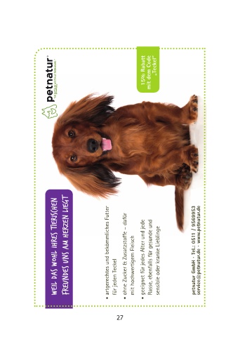 artgerechtes und bekömmliches Futter ohne Zucker & Zusatzstoffe – dafür mit hochwertigem Fleisch geeignet für jedes Alter und jede Rasse, ebenfalls für gesunde und sensible oder kranke Lieblinge petnatur GmbH · Tel.: 0511 / 9569953 service@petnatur.de · www.petnatur.de