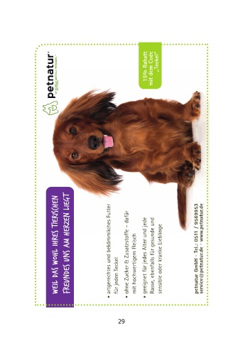 artgerechtes und bekömmliches Futter ohne Zucker & Zusatzstoffe – dafür mit hochwertigem Fleisch geeignet für jedes Alter und jede Rasse, ebenfalls für gesunde und sensible oder kranke Lieblinge petnatur GmbH · Tel.: 0511 / 9569953 service@petnatur.de · www.petnatur.de