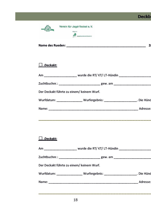 Am ___________________ wurde die RT/ KT/ LT-Hündin _____________________________________________________________________________Zuchtbuchnr.: ________________________ gew. am _______________________Der Deckakt führte zu einem/ keinem Wurf.